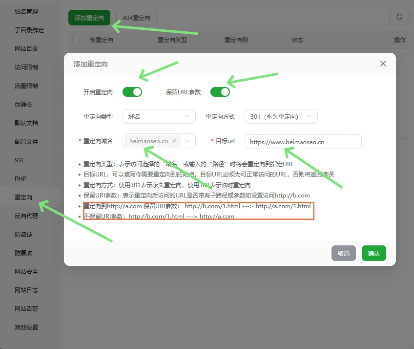 如设置访问https://www.heimaoseo.cn 重定向到https://www.heimaoseo.com 保留URI参数: https://www.heimaoseo.cn/yanyuseo/ —> https://www.heimaoseo.com/yanyuseo/