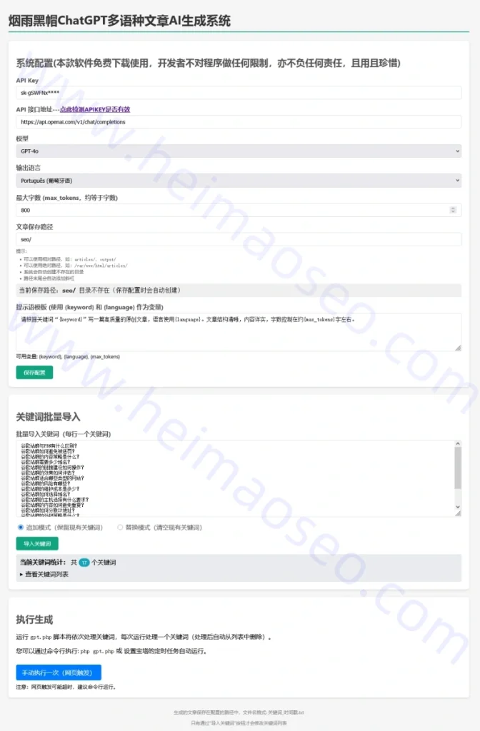 烟雨黑帽ChatGPT多语种文章AI生成系统是一款基于OpenAI ChatGPT开发的自动化内容生产工具,专为SEO从业者、站群运营者、内容创作者设计。系统支持多语种输出、关键词批量管理、文章自动保存、API连接调试等功能,可大幅提升内容生产效率。