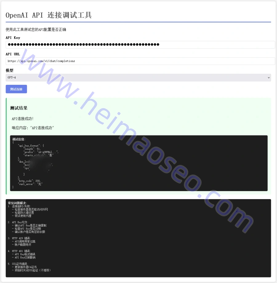访问 api.php,输入API Key、接口地址和模型,点击“测试连接”即可查看详细调试信息。
