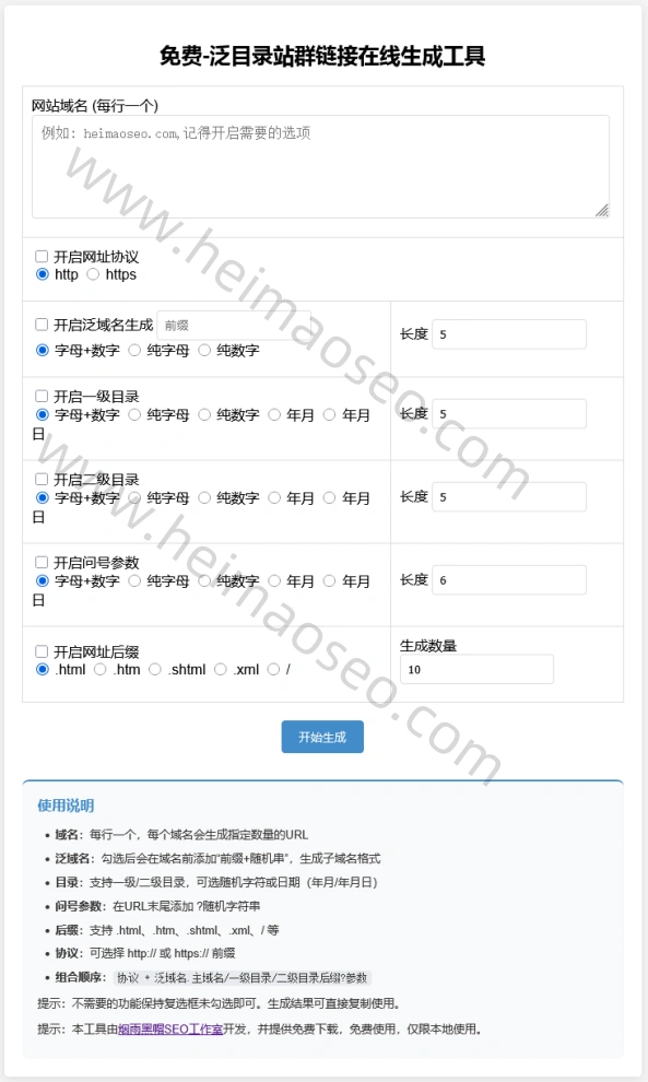 泛目录站群链接在线生成工具是一款专为SEO从业者设计的免费工具,支持批量生成带有泛域名、多级目录、动态参数、后缀等多种组合形式的URL链接。适用于站群建设、泛目录链接生成、蜘蛛池生成外推搜索留痕链接等SEO场景。工具界面简洁,功能强大,支持本地部署使用,完全免费。